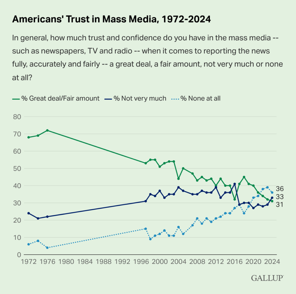 The dispute occurs amid a broader crisis of trust in American media institutions. According to Gallup polling, Americans’ trust in mass media has declined from over 70% in the 1970s to just 36% in 2024, with nearly two-thirds expressing little confidence in media’s ability to report news fully, accurately, and fairly.